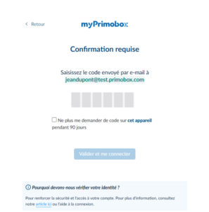 - Lors de votre connexion à votre compte myPrimobox, après avoir saisi votre adresse e-mail et votre mot de passe, vous recevrez un code d’identification unique envoyé à l’adresse e-mail associée à votre compte.