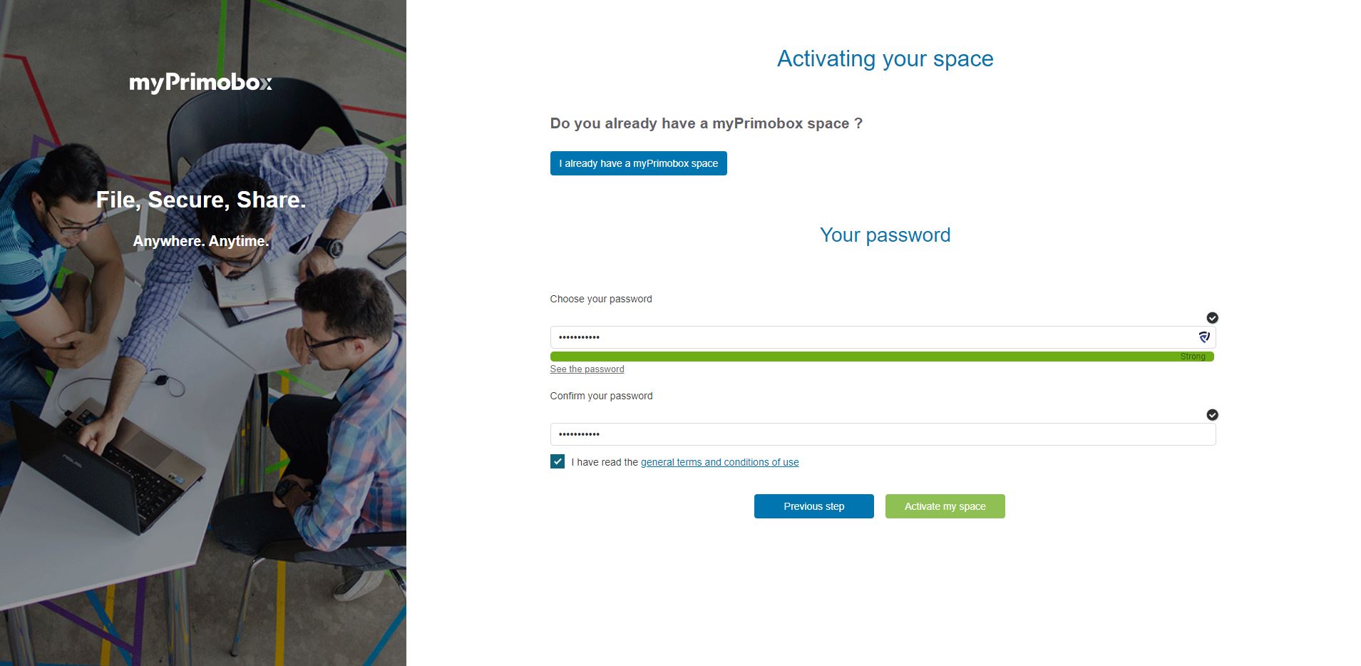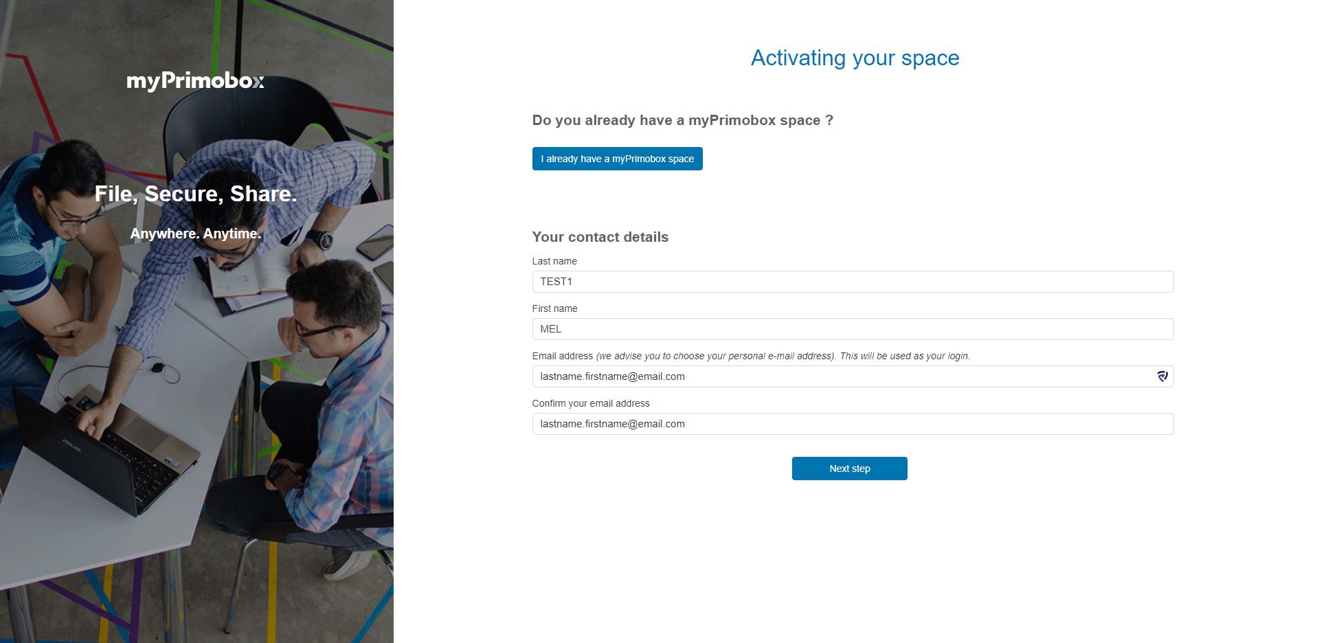 If you already have a myPrimobox space and have just received an email to activate a second space (in the same company or in a new company), you can click the activation link in the email.