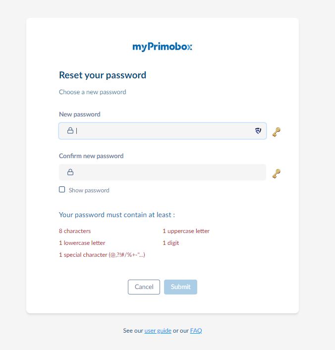 3. A new page is displayed. You will then be asked to enter the email address associated with your myPrimobox space in order to send you the link to reset your password. Enter your email in the dedicated field as shown below: