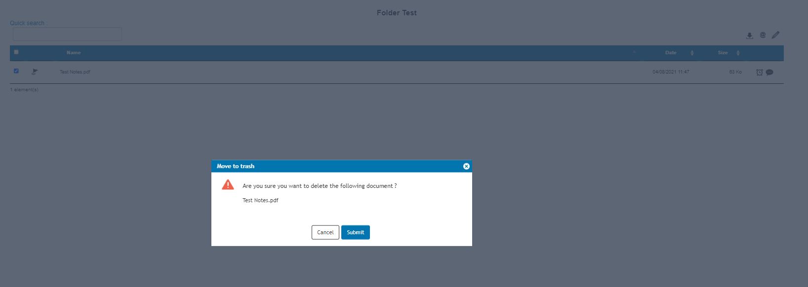 Once deleted, the document goes into the recycle bin. To permanently delete it from your myPrimobox space, you can empty the recycle bin. This action cannot be undone.